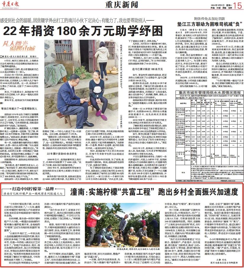 “我们还在积极探索建立‘村企联合、基地联户、产业连片、股份连薪、责任连体’五联模式,推动‘公司+基地+服务’订单农业,建成柠檬标准园100余个,新增、改造标准化柠檬基地10万亩,稳定提供周边农户就业岗位10万个,带动人均增收6000余元。”潼南区农业农村委主任胡广建表示。