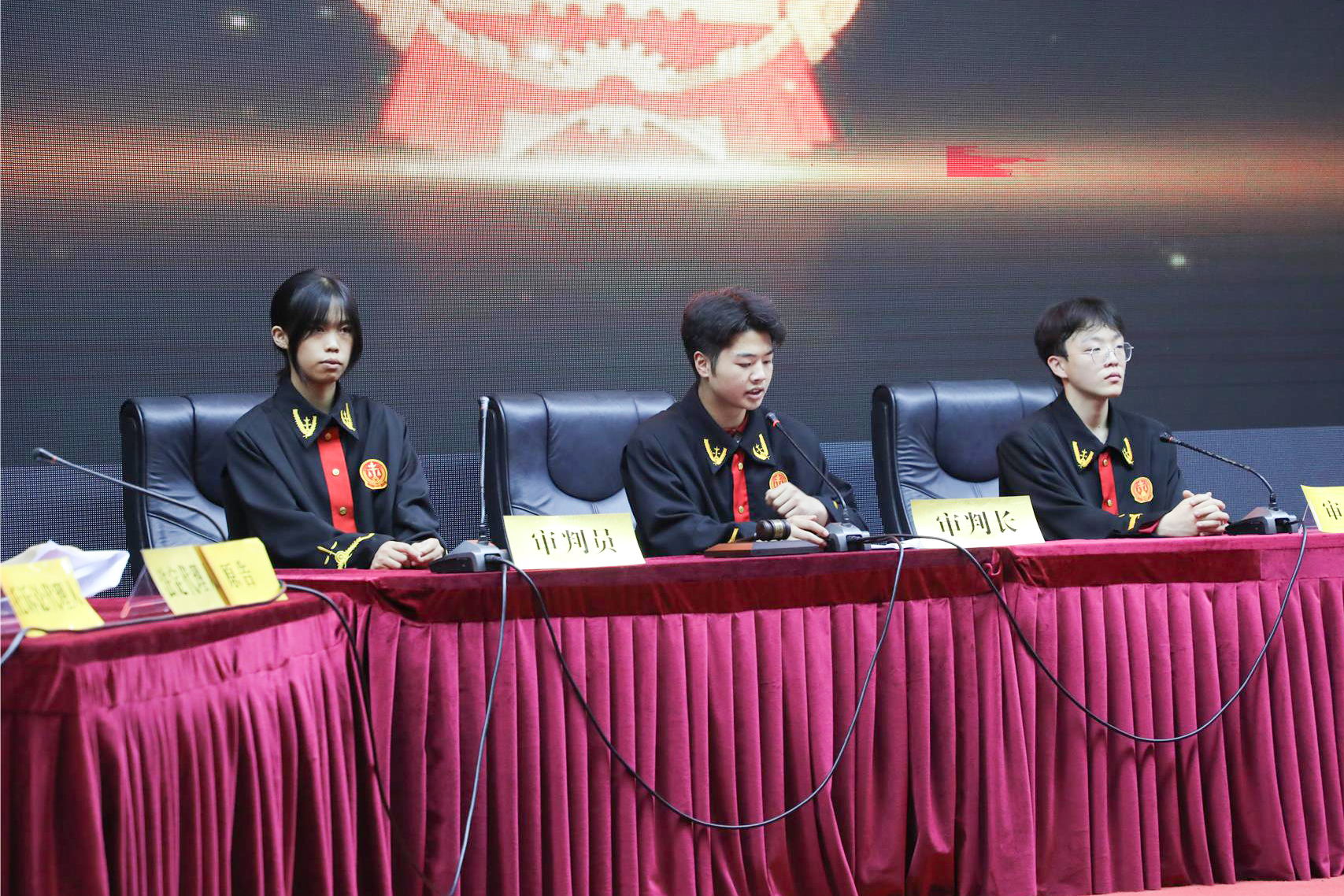 “现在请审判长、审判员入庭,全体起立……”随着“书记员”宣读完法庭纪律,“模拟法庭”正式拉开序幕。学生们身穿制服,分别“扮演”法官、人民陪审员、书记员、原告、被告及其代理人等角色,并按法定程序,有条不紊地进行各个环节,围绕案件争议焦点展开激烈辩论。整个庭审过程自然流畅,环环相扣,最大程度地还原了庭审的真实现场。
