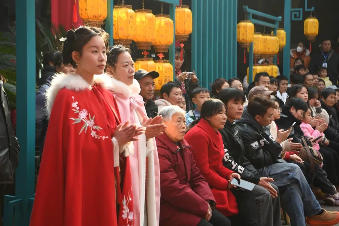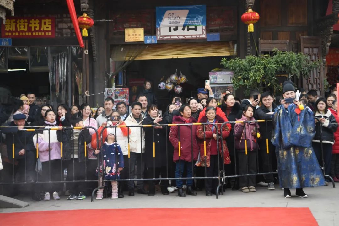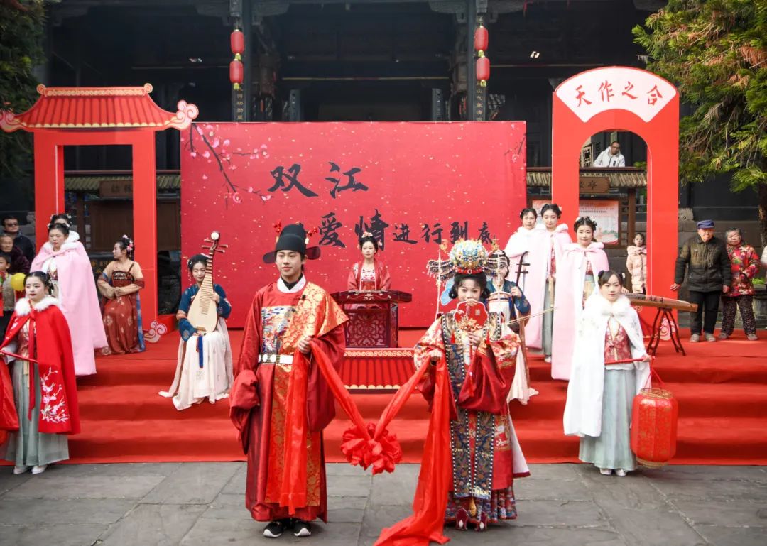 在双江古镇,剧游活动现场也氛围热烈。游客们身着古装穿梭其中,沉浸式体验“情定双江 好事成双”明清婚礼剧游,在禹王宫、水街莲花池等12个古韵场景中解锁精彩剧情。