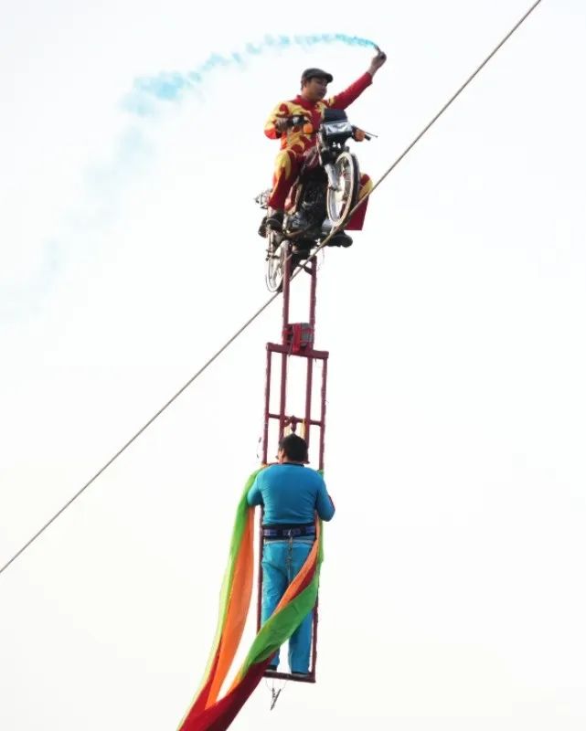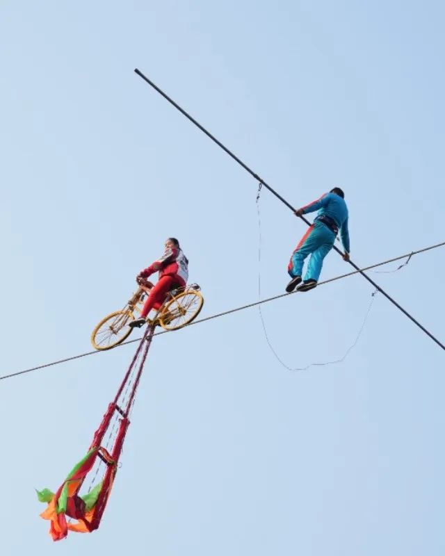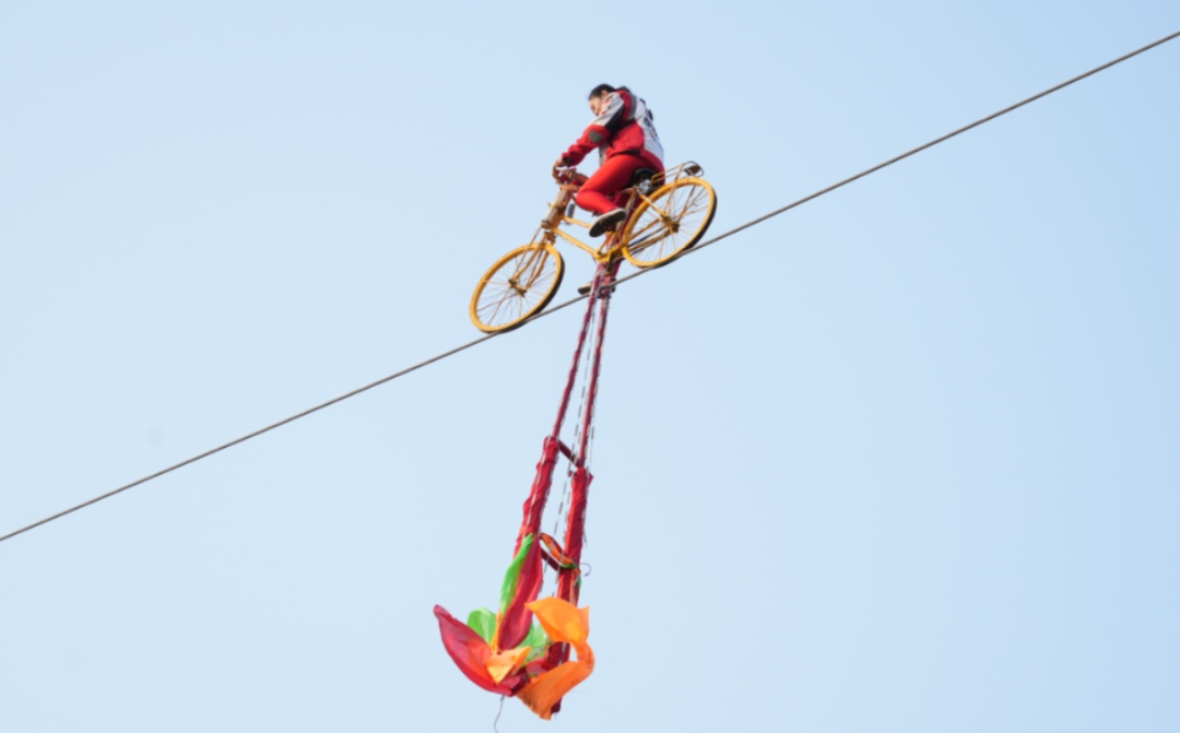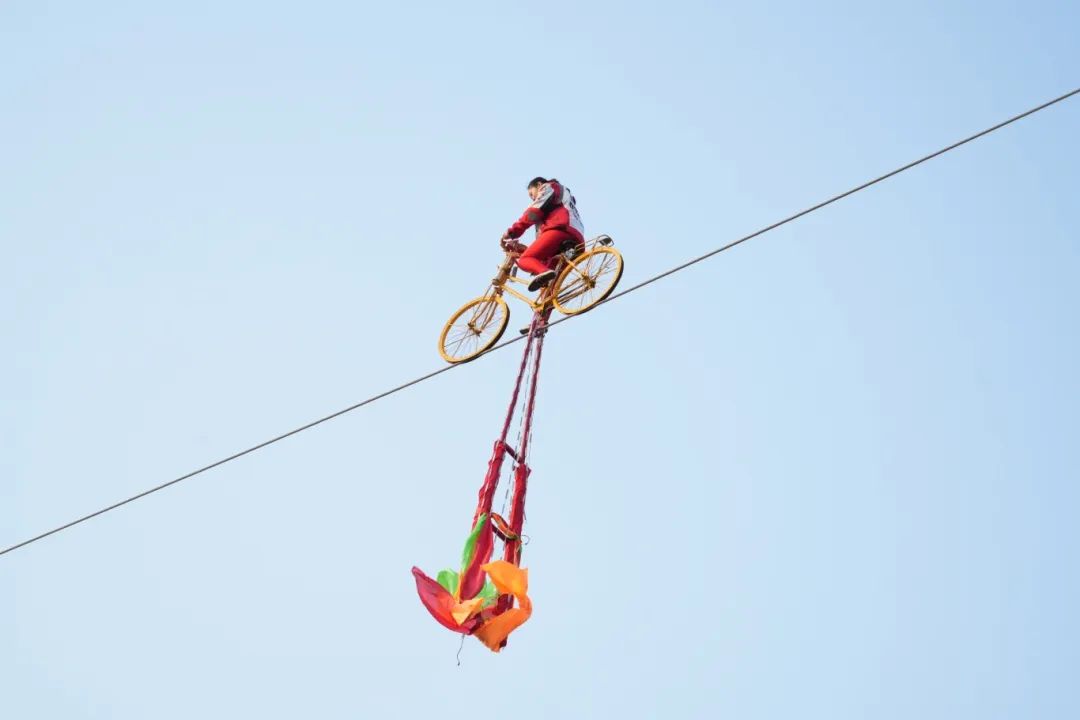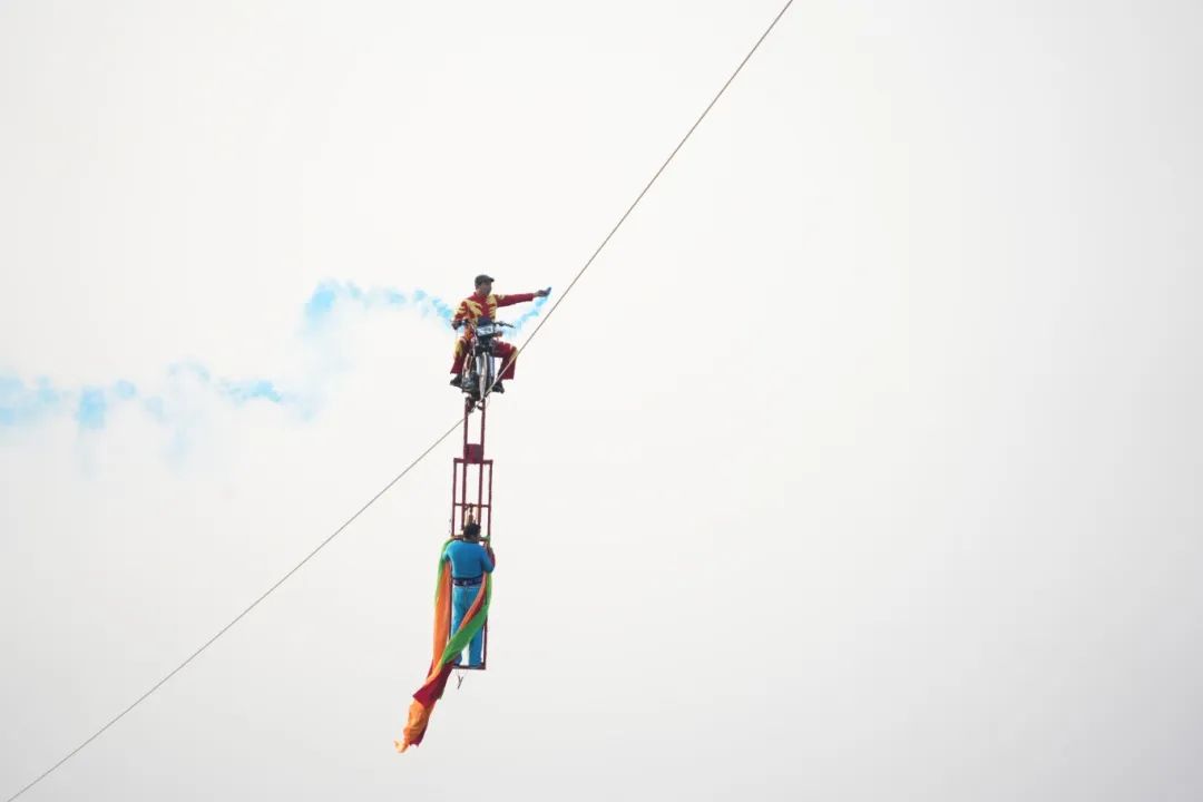 除夕当天,世界宽谷高空钢丝首秀在金福岛龙舟广场至大佛寺游船码头震撼上演。15米高的涪江上空,专业杂技演员凭借精湛技艺,在500多米宽谷间挑战极限,平衡杆花式走钢丝、摩托车飞跃钢丝、自行车钢丝舞蹈等精彩杂技表演,引得现场观众阵阵惊呼,掌声、欢呼声此起彼伏,将活动氛围推向高潮。