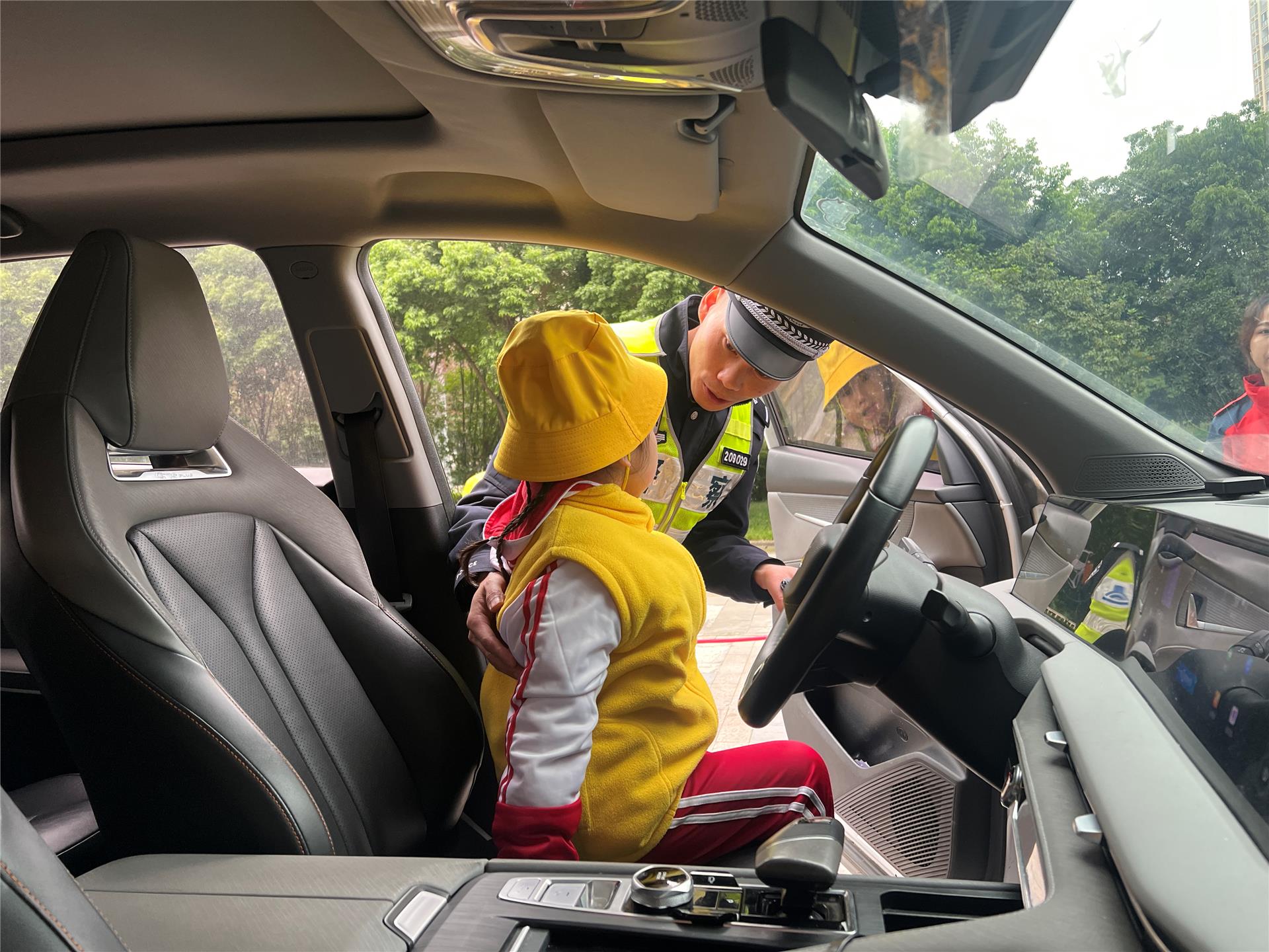 随后,为让小朋友认识汽车盲区带来的交通安全隐患,民警在确认安全的前提下,指引小朋友扮演“体验员”,分别蹲在车辆四周,邀请小朋友坐进主驾驶位,以驾驶员的视角,通过车窗和后视镜观察周围,在“沉浸式”的体验中感受汽车盲区带来的危险。
