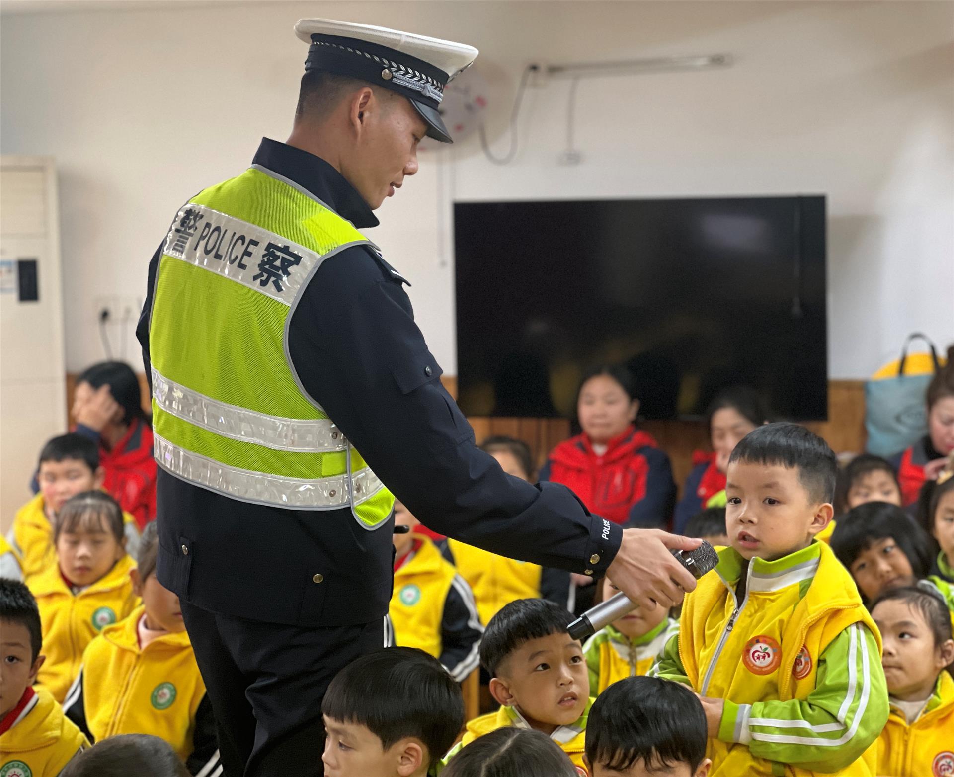 为加深记忆,民警还与小朋友们进行互动问答游戏,结合幼儿的年龄特点,用通俗易懂的语言让小朋友们认识道路上常见的交通标志、标线所代表的含义,学习到日常出行常用的交通安全知识,将“红灯停、绿灯行、黄灯亮了等一等”“一看二慢三通过”等安全知识深入童心。
