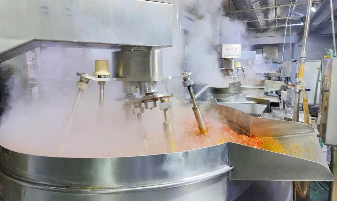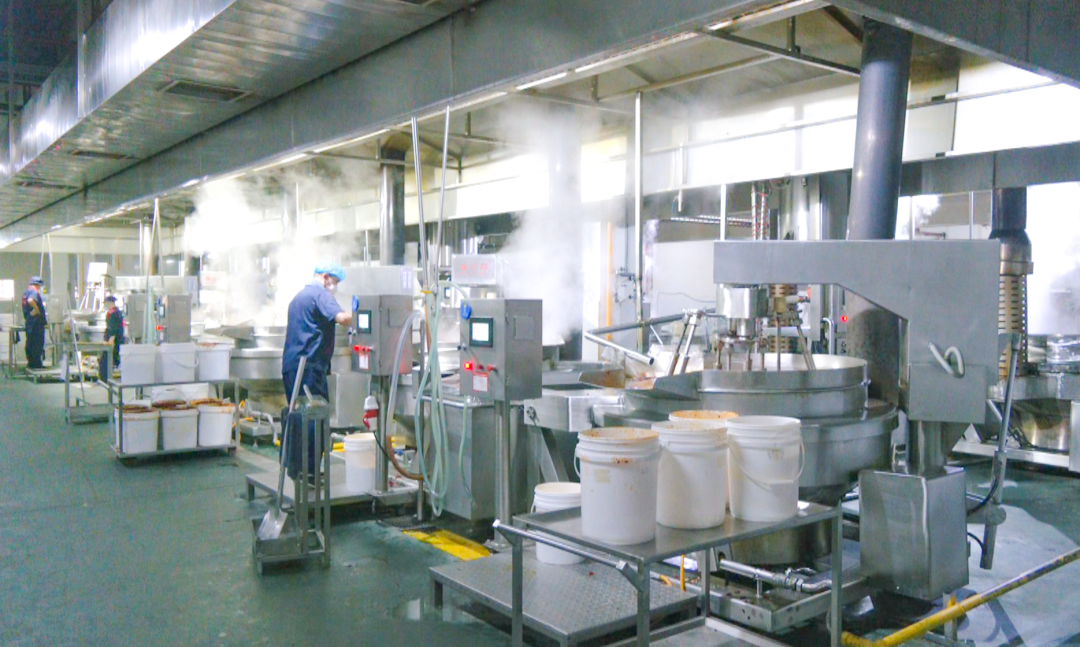底料独创的“三熬、三焖、三沉”技术,可实现火锅底料、火锅红油的独特口味生产,在川渝地区调味料乃至整个火锅产业中,拥有良好口碑。图为火锅底料生产车间。