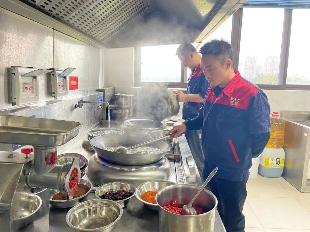 图为公司产品研发室内,几名从业20余年的炒料师正在配制新的火锅底料。