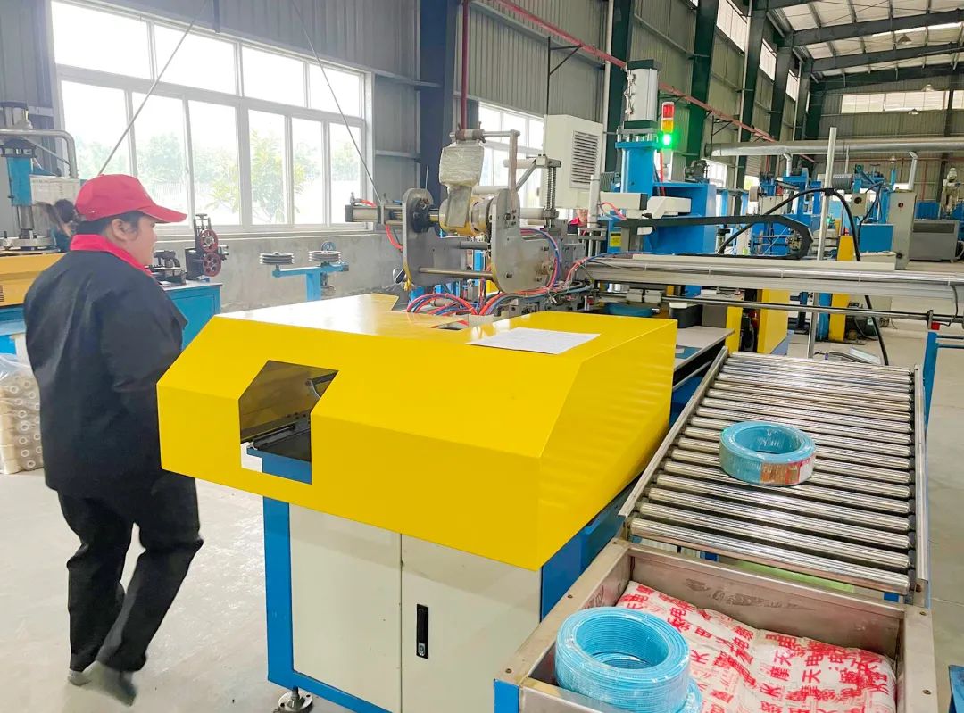 以前使用的是半自动成圈机,每台机器线缆缠绕后需要一名工人进行包装、贴纸。引进全自动成圈机后,3台设备只需一名工人操作。图为全自动成圈机。