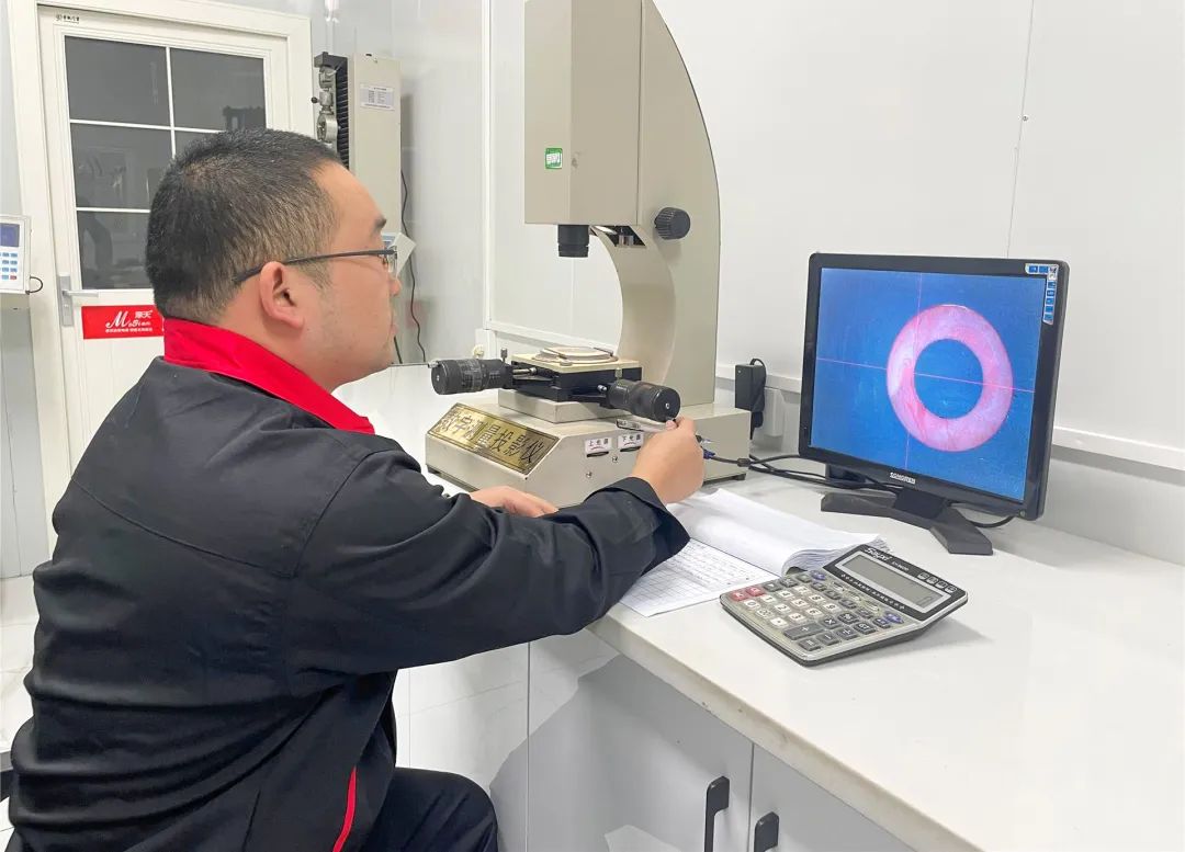 采用的原材料主要为云铜,铜的纯度高达99.99%;花费近百万建立产品检测室,引进数字测量投影仪、智能导体电阻测试仪、拉力机等,保证“摩天牌”电线电缆产品出厂合格率达到100%。图为工作人员通过数字测量投影仪测量产品。
