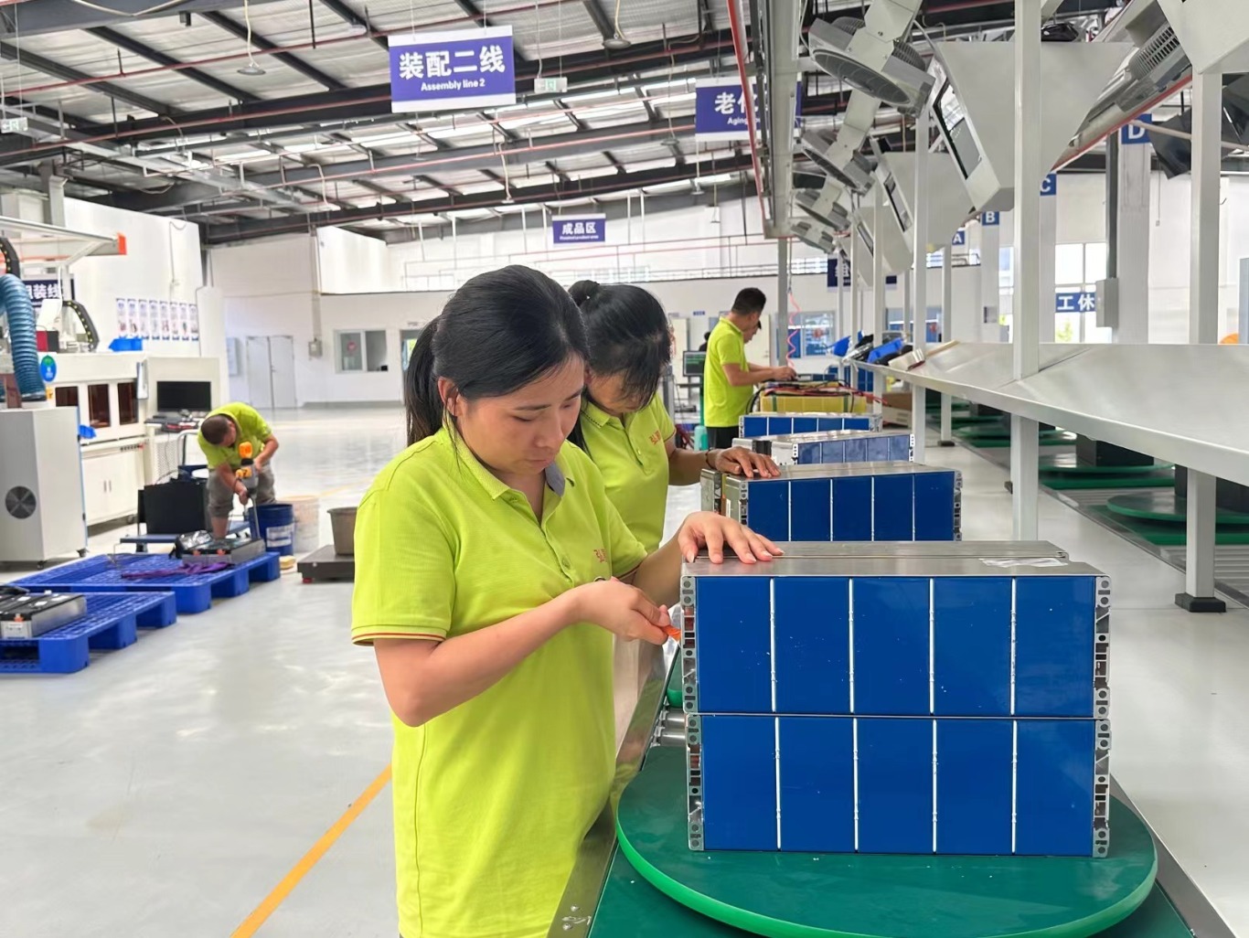弘喜汽车车间内工人正组装电池