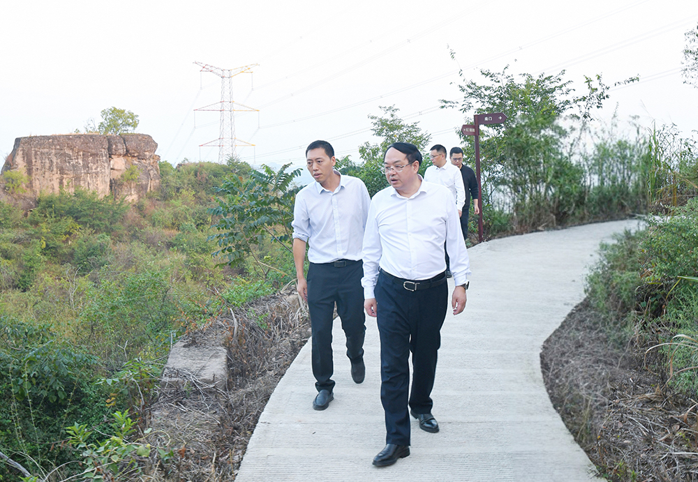 文天平沿着环山步道察看自然环境、人文景观及基础设施建设,详细了解资源保护利用、文旅项目打造等情况。文天平说,天台山是潼南南部第一高山,自然景观秀美,历史人文丰富,发展文旅有条件有基础,要突出特色、彰显亮点,结合全国最大的石刻卧佛、独具特色的古寨墙等,深度整合历史人文和自然景观资源,丰富拓展户外露营、徒步、乡村休闲、生态康养等业态,打造一批热门“打卡点”,做靓渝西山乡旅游新名片,吸引更多人气、流量,把山水人文特色资源转化为发展优势。