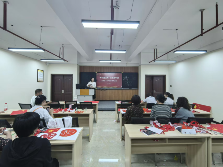 活动现场,指导老师为大家详细介绍了剪纸艺术的历史传承和各个时期的特点。随后,大家围坐在一起,纷纷拿起剪刀按照图样细心地进行剪纸创作。红纸翻飞间,一幅幅国旗、党旗、党徽及五角星等作品逐渐成形,表达了对祖国繁荣富强、欣欣向荣的美好祝福。