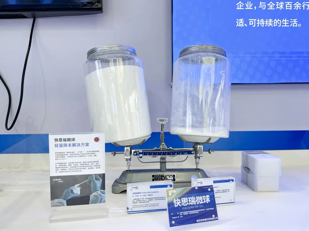 在重庆快思瑞科技有限公司(以下简称“快思瑞”)展厅,两个放置在天平两端、重量相等的罐子吸引了记者的注意。走近细看,其中一个写着“快思瑞微球-发泡前”的罐子里,装着少许像面粉一样的白色粉末;而另一个写着“快思瑞微球-发泡后”的罐子,则几乎装满了这样的白色粉末。