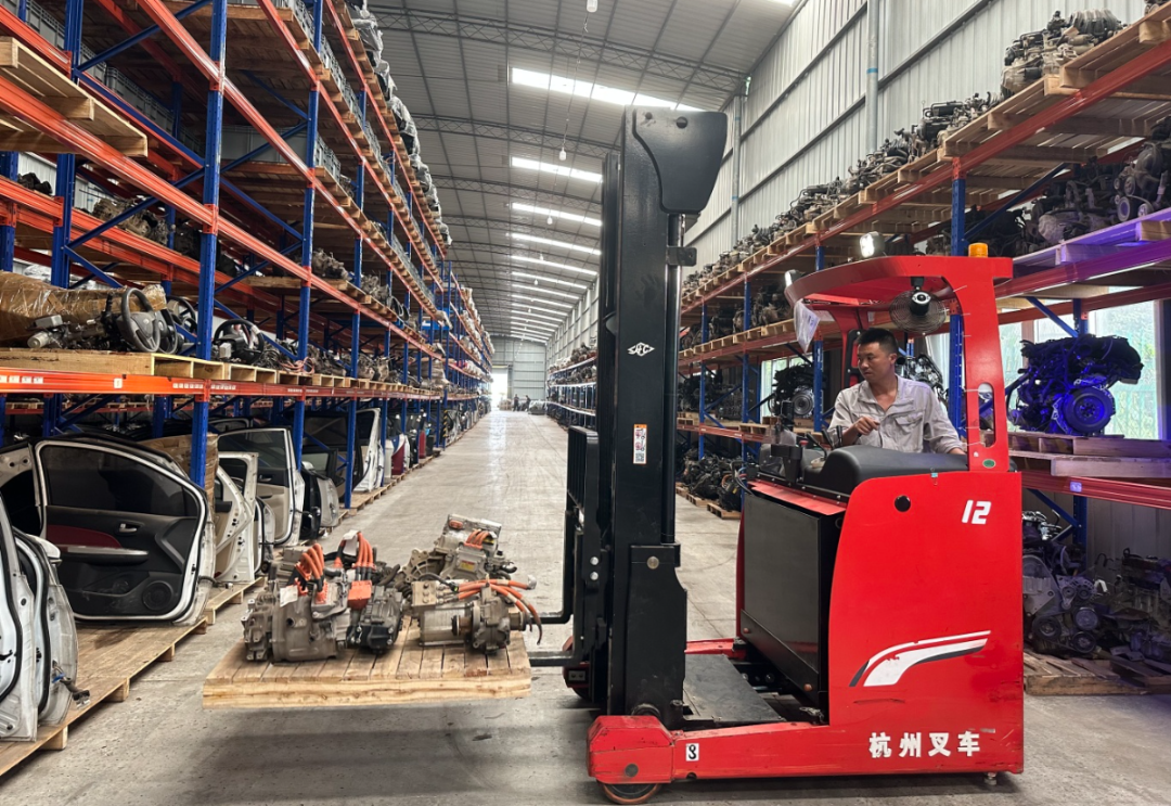 智能识别、拆解、重组、再制造……车间内,各种设备高效运转,经过一道道工序,轮胎、车灯、电池、发动机等零部件被一一拆解下来,分门别类存放在仓储货架上,等待去往新的地方。