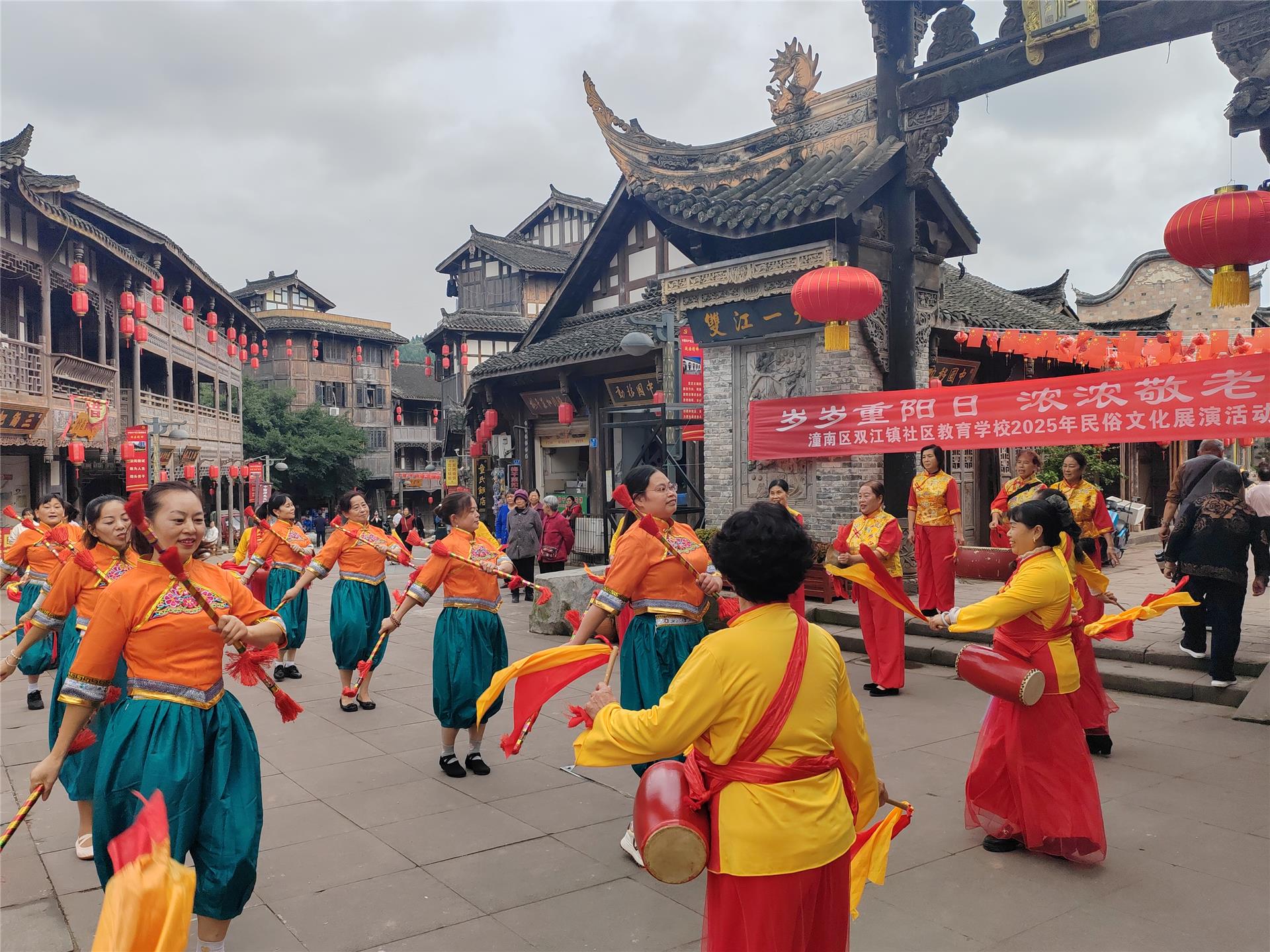 展演队伍从古镇正街牌坊出发,沿双江正街、河街巡游汇演,学员们以灵动的莲萧舞和激昂的腰鼓表演,展现传统技艺魅力,传递节日祝福。