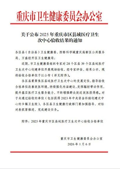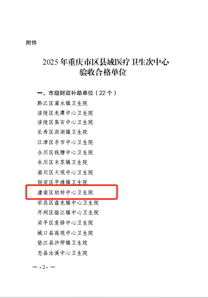 近日,市卫生健康委公布《2025年重庆市区县域医疗卫生次中心验收结果的通知》,潼南区柏梓中心卫生院成功创建为“区县域医疗卫生次中心”
