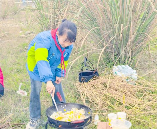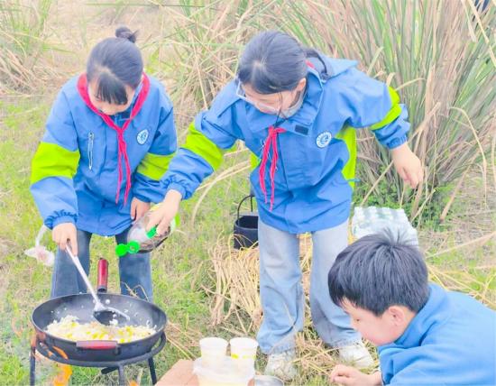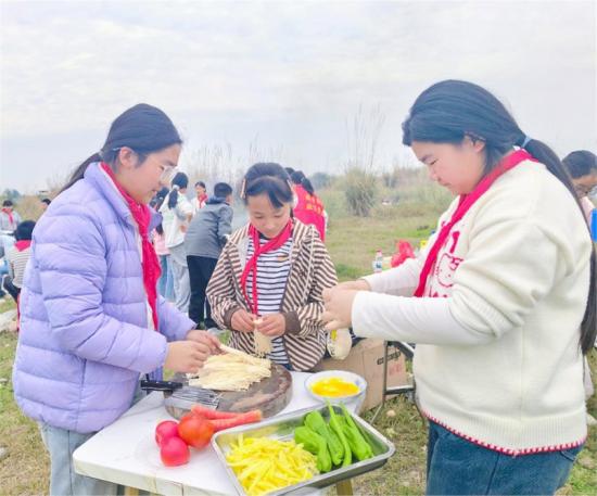 分工协作田野升起炊烟 活动当天,天朗气清,惠风和畅。孩子们怀着欢快的心情,在老师的带领下,背上柴火、锅碗,有序地向野炊地点进发。沿途,青青的油菜地一望无际,蜿蜒的运河静静流淌,波光粼粼。孩子们难得与大自然如此亲近,一路上欢呼雀跃,言语间满是对野炊的期待。 “这是我第二次参加学校的野炊活动了,比上一次还要激动!”五年级学生张雨桐一边走一边告诉记者,“昨天晚上我兴奋得都没睡好,一直在想今天要做什么菜。” 经过约半小时的步行,队伍抵达了位于田野间的活动场地。放眼望去,空旷的田野与远处的村庄相映成趣,春风拂面,空气中弥漫着泥土和青草的气息,为这场特殊的“课堂”增添了无限生机。 到达目的地后,原本安静的田野顿时热闹起来。在老师的指导下,孩子们迅速分组,各司其职。有的挖坑搭灶,有的拾柴生火,有的洗菜切肉,有的掌勺翻炒,忙而不乱,井然有序。 “火再大一点!”“盐放够了吗?”“我的菜要出锅啦!”此起彼伏的吆喝声、锅铲碰撞的叮当声、柴火燃烧的噼啪声,交织成一首独特的“劳动交响曲”。 番茄炒蛋、蒜苔炒肉、青椒土豆丝……一道道家常菜在孩子们手中相继出锅。更有小组端出了火锅大杂烩、烧烤串串、什锦炒饭等“硬菜”,引得其他小组的同学纷纷前来“取经”。炊烟袅袅,菜香四溢,欢声笑语在田野上空久久回荡。 六年级学生李思琪所在小组做的是番茄炒蛋,她一边翻动着锅里的菜肴,一边对记者说:“平时在家都是爸爸妈妈做饭,今天自己动手,才发现做饭并不简单,每一步都很有讲究。看到大家吃得开心,我觉得特别有成就感。”