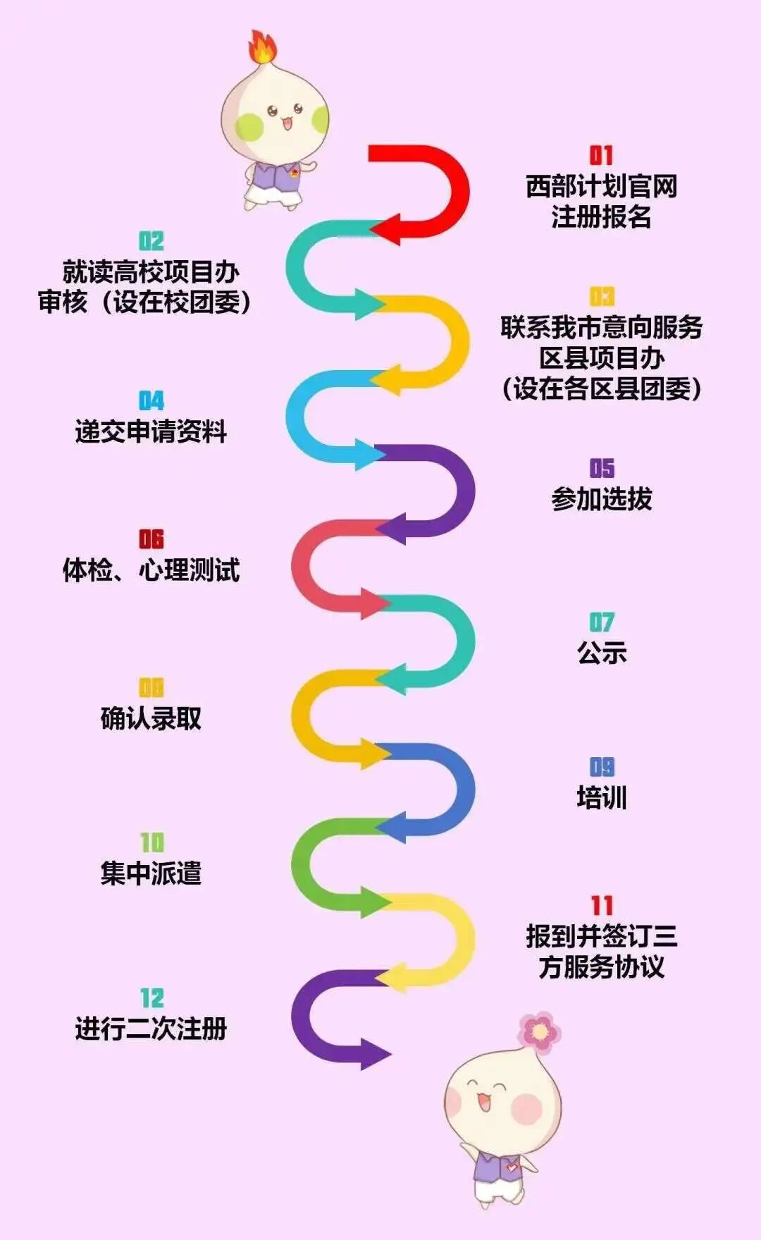 2. 由我市招募后派遣至外省服务。 西部计划官网(西部计划报名系统)注册报名→高校项目办(设在校团委)审核→参加就读高校选拔→体检、心理测试→公示→确认录取→系统岗位对接→集中派遣。(后续流程以服务地通知为准)