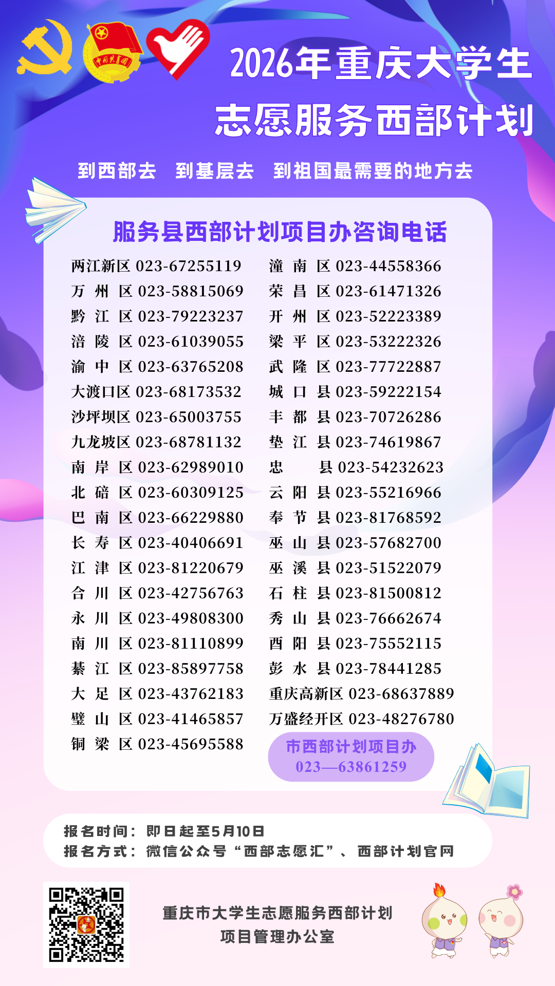 更多2026年重庆西部计划招募信息,请持续关注“重庆共青团—工作平台”微信公众号。 联系我们